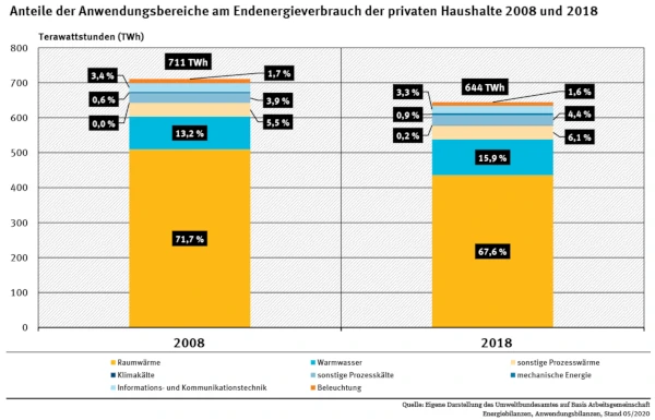 Neben dem genannten Haushaltsstrom verbrauchen wir im Durchschnitt mehr als 4 mal so viel Energie für Heizung und Warmwasserbereitung. Das sind also über 80% der im Haushalt insgesamt verbrauchten Endenergie. Die Tendenz ist durch effizientere Gebäude bereits leicht fallend, für den Klimaschutz ist das aber noch zu wenig. Zur Wärmeerzeugung sollte man deshalb statt Heizungen nur noch moderne, gute Technik einsetzen, z. B. sehr effiziente Wärmepumpen, die Umweltenergie nutzen. Dadurch braucht man für dieselbe Wärmeleistung viel weniger (fossile oder selbst erzeugte) Primärenergie. Wärmepumpen nutzen überall frei verfügbare Umweltwärme (Lufttemperatur, Erdwärme, Grundwassertemperatur etc.) als Energiequelle und „heben“ geringe Temperaturen umgekehrt zum Kühlschrankprinzip auf nutzbare Temperaturen an. Gute Wärmepumpen benötigen in etwa 1/4 bis 1/7 der Energie um die gleiche Wärmeleistung zu erbringen. Das bedeutet, dass wir mit Wärmepumpen den Heizenergieverbrauch drastischen senken können und das auch tun sollten. Wie funktioniert das?